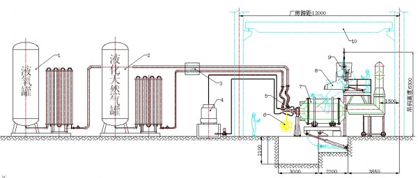 1—液氧站 2—液化天然氣站 3—氧氣和天然氣計量系統(tǒng) 4—燒咀冷卻水系統(tǒng) 5—純氧燒咀 6—3噸澆包