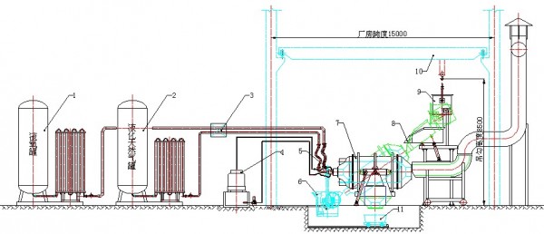 6—澆包 7—8噸純氧燃?xì)饣F爐 8—加料溜槽 9—加料桶 10—12噸梁式吊車 11—渣桶