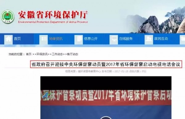 據(jù)安徽省環(huán)境保護廳發(fā)布消息,省政府召開電視電話會議,部署迎接中央環(huán)保督察以及對合肥、宿州、蚌埠、六安、安慶等5市開展省環(huán)保督察工作。