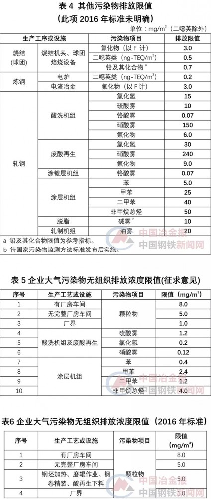 下列表格中“征求意見”是指河北省2018年4月份發(fā)布的《鋼鐵工業(yè)大氣污染物超低排放標(biāo)準(zhǔn)》(征求意見稿)內(nèi)容,“2016年”標(biāo)準(zhǔn),是指《河北省環(huán)境保護(hù)廳關(guān)于河北省鋼鐵行業(yè)執(zhí)行大氣污染物特別排放限值的公告》(2016年 第1號(hào))中規(guī)定的排放限值。