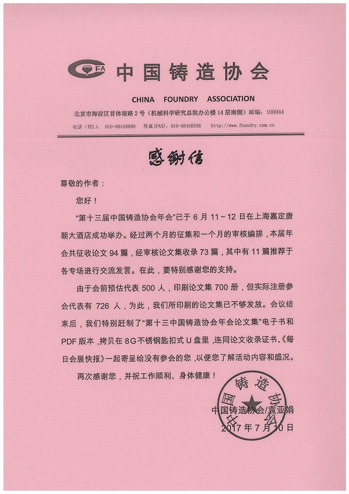 中國鑄造協(xié)會感謝信